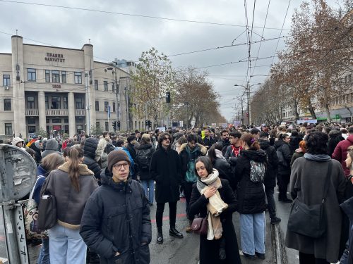 Združeni protest studenata Pravnog i tehničkih fakulteta završen je danas posle petnaestominutne blokade raskrsnice Bulevara kralja Aleksandra, Beogradske i Ulice Starine Novaka ispred Pravnog i simboličnog odajvanja počasti poginulima u padu nadstrešnice na železničkoj stanici u Novom Sadu 1. novembra.