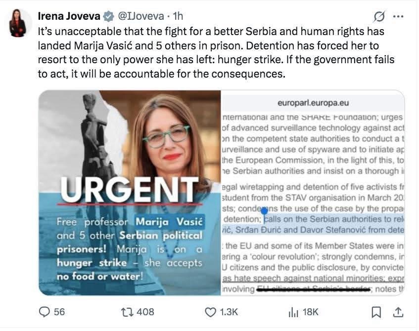 Evropslanica Irena Joveva zatražila je hitno oslobađanje profesorke Jovine gimnazije Marije Vasić koja štrajkuje glađu i žeđu i ostalih petoro pritvorenih aktivista.