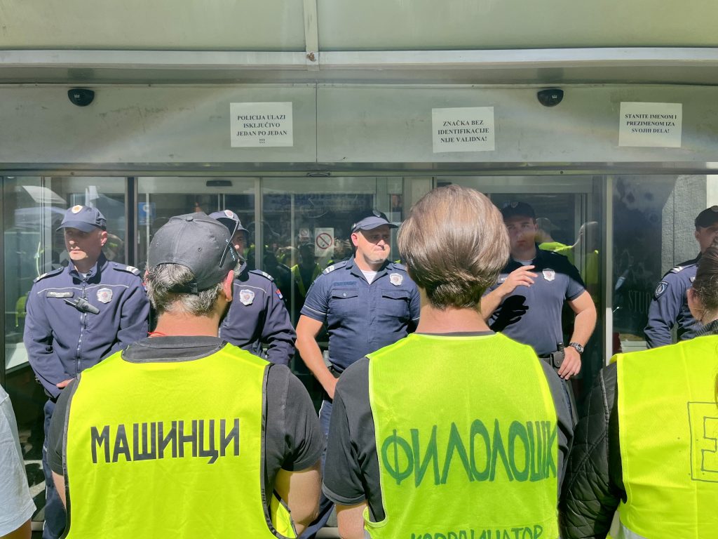 Studenti preko 40 sati blokiraju zgradu Radio televizije Srbije u Takovskoj, kao i njen studio u Košutnjaku. Jutro je počelo uz tenzije kada je policija u punoj opremi potisnula građane i studente kako bi uvela radnike ove medijske kuće kroz nezvaničan ulaz. Kroz lokal brze hrane prošlo je petnaestak radnika i radnica ove televizije.