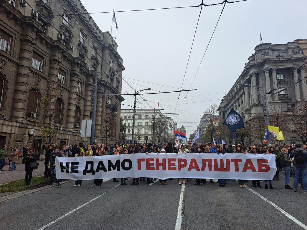 Rušenje Generalštaba značilo bi „rušenje pamćenja, brisanje istorije i ponižavanje svakog građanina Srbije, poručili su sa protesta. „Upozoravamo. Nećemo mirno gledati rušenje Generalštaba i gaženje zakona i ustava. Odbrana Generalštaba je odbrana dostojansta, pravne države i naše budućnosti“, rekla je jedna od studentkinja Arhitektonskog faklulteta.